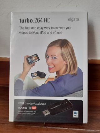 Elgato Turbo 264 HD es un decodificador acelerador que convierte videos para Mac,iPod y iPhone.El Turbo.264 HD es un dispositivo gracias al cual podemos conseguir aceleración de hardware y conversión de archivos de una forma rápida y barata,se requiere un procesador Intel Core; sistema operativo OS X 10.5.8 Leopard (o superior); QuickTime 7.6 (o posterior) y 512MB de RAM.formatos de entradaVideo AVCHD, QuickTime, AVI, DV, MPEG-1, MPEG-2 Program/Transport Stream, MPEG-4, MP4, M4V, .MTS, H.263, H.264 AVC, Xvid, VIDEO_TS, MKV y muchos más.formatos de salida iPad, iPhone, iPod, Apple TV, YouTube, YouTube HD, HD 720p, HD 1080p, Sony PSP