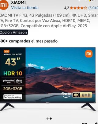 Televisor Xiaomi de 43 pulgadas con resolución 4K UHD. Modelo F 43. - Pantalla de 43 pulgadas (109 cm). - Resolución 4K UHD. - Smart TV con Fire TV integrado. - Control por Voz Alexa. - Compatible con Apple AirPlay. - Memoria de 2GB RAM + 32GB almacenamiento.