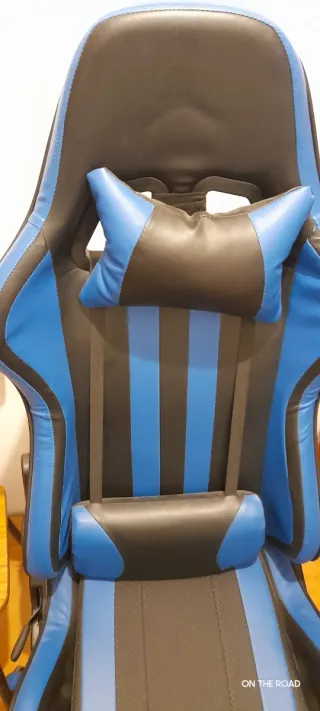 Silla ergonómica de estilo gamer, diseñada para largas sesiones. - Tapicería en polipiel azul y negro. - Respaldo alto con soporte lumbar. - Reposapiés extraíble. - Reposabrazos acolchados. -Respaldo reclinable