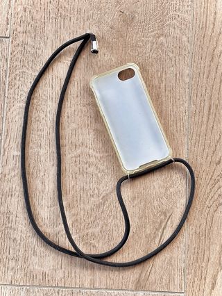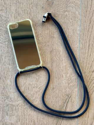 Funda para iPhone 7 con un práctico cordón para llevarla colgada. Su diseño permite tener el móvil siempre a mano. - Funda dorada con acabado espejo. - Cordón negro ajustable. - Cierre metálico en el cordón.