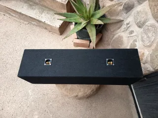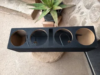 Cajón para altavoces de medios de coche. Está fabricado en madera y forrado en moqueta negra. - Doble compartimento para altavoces. - Diseño rectangular.