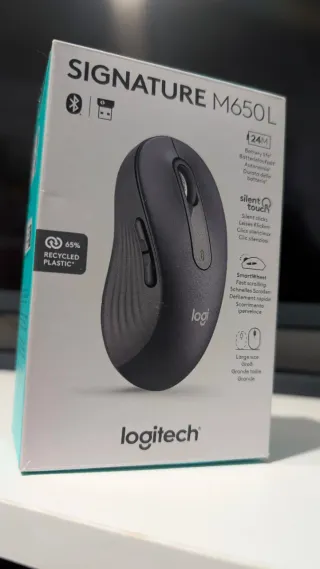 Ratón ergonómico Logitech Signature M650L, diseñado para un uso cómodo y prolongado. Ideal para manos grandes. - Prácticamente nuevo, sin uso - Conexión Bluetooth y receptor USB. - Botones con clics silenciosos. - Rueda de desplazamiento SmartWheel para scroll rápido. - Fabricado con un 65% de plástico reciclado.