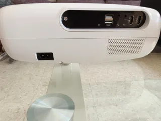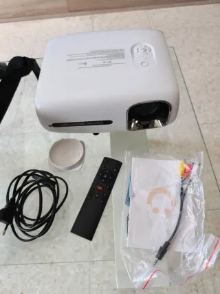 Proyector Yaber Pro V7 en color blanco. Incluye mando a distancia y cables. - Brillo: 9500-12000 lúmenes. - Resolución: Nativa 1080p Full HD. - Conectividad: WiFi de doble banda (5G/2.4G) y Bluetooth. - Mando a distancia incluido. - Cable de alimentación. - Cable AV.