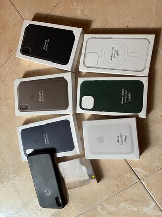 Lote de accesorios para iPhone. Se venden por separado o en lote. Lote 75€ Separado, consultar producto y ofertar. Gracias y disculpad. - Funda de piel negra para iPhone X. - Funda de piel marrón para iPhone X. - Funda de piel azul marino para iPhone X. - Funda transparente para iPhone 13 mini. - Funda de piel verde para iPhone 13 mini. - Batería externa MagSafe para iPhone. Pongo ese precio para que me de la posibilidad de envío . Gracias.