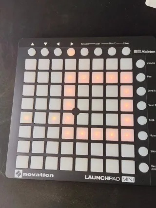 Controlador MIDI Ableton Launchpad Mini en color negro. Ideal para producción musical. - 64 pads RGB sensibles a la velocidad. - Conexión USB. - Compatible con Ableton Live y otros DAWs.Launchpad Mini Novation para Ableton – perfecto estadoDescripción: Vendo Novation Launchpad Mini (MK1), ideal para producir y lanzar clips en Ableton Live o como controlador MIDI en cualquier DAW. Ha tenido muy poco uso, todas las luces y pads funcionan correctamente y nunca ha salido de casa. Perfecto para empezar en la producción electrónica. No tengo la caja pero es posible que la encuentre