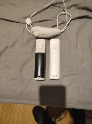 Mandos para consola Wii de la marca Reflex. Incluye dos mandos y un nunchuk. Dos fundas de mando tambien incluidas Los dos funcionan pero la tapa negra al poner las pilas parece que no encaja