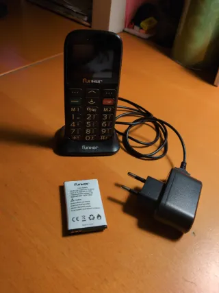 Teléfono móvil básico con función SOS. Se tiene que cambiar la bateria - Botón SOS dedicado para emergencias. - Base de carga incluida. - Batería de repuesto. - Cargador de pared.