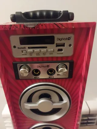 Altavoz de la marca DigiVolt con un llamativo diseño. Potencia 5 w - Color rojo con detalles plateados. - Altavoces frontales. - Panel de control superior con pantalla. - Conexiones para micrófono.