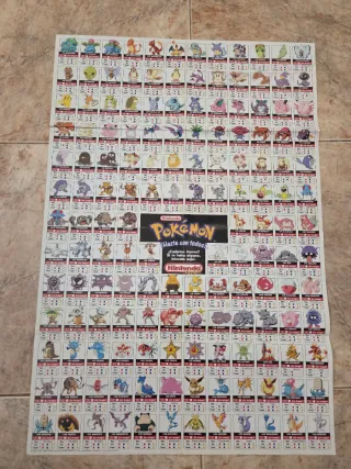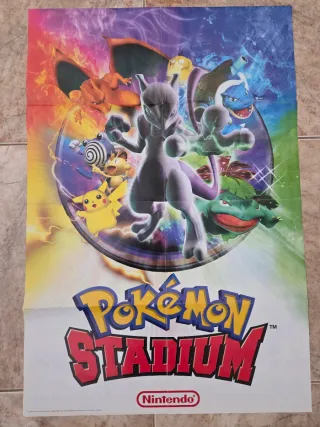 🎮 Póster promocional OFICIAL de Pokémon Stadium para Nintendo 64, doble cara y de época (1999-2000). Material exclusivo que se distribuyó en tiendas en el lanzamiento del juego. ✨ CARA A: Artwork espectacular con Mewtwo, Pikachu, Charizard, Blastoise, Venusaur y más Pokémon icónicos con efectos elementales. 📊 CARA B: Guía completa de los 151 Pokémon de primera generación con sus estadísticas del juego. ⚠️ ESTADO: Presenta marcas de dobleces y algunas roturas en esas zonas (típico de pósters guardados doblados). Reparable con celo transparente por el reverso. 🔥 Pieza AUTÉNTICA de Nintendo 📦 Entrega en mano o envío