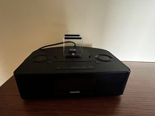 Radio-despertador Philips, con base de carga para iPhone/iPod/iPad. Tiene un puerto usb. Reproduce música desde iPhone. También funciona con pilas. Pueden probar sin compromiso