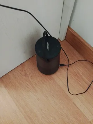 Altavoz portátil de la marca Bose en color negro. Diseño cilíndrico con asa superior para facilitar su transporte. - Asa de transporte. - Botones de control en la parte superior.