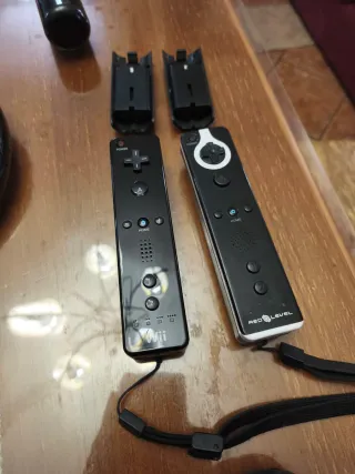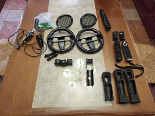 Lote de mandos y accesorios para Wii/Wii U - Dos mandos de control (uno no es original) - Baterias recargables compatibles con los mandos - Volante para juegos de carreras. - Fundas protectoras para mandos. - Raquetas y bate de beisbol - Nunchuk y Motion Plus - Correas de seguridad y adaptadores