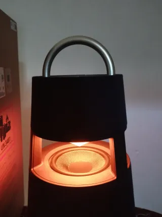 Altavoz portátil LG XBOOM 360 RP4 con luces de ambiente. - Diseño omnidireccional. - Asa para transporte. - Luces LED integradas.