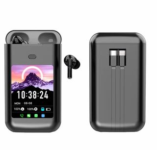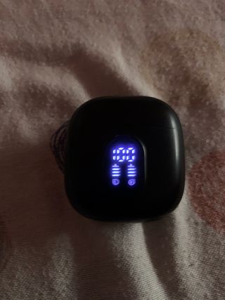 Auriculares inalámbricos en color negro con una pantalla LED frontal que muestra el nivel de batería. - Indicadores LED para batería de auriculares. - Diseño moderno y compacto.