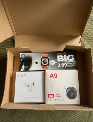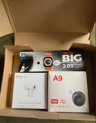 Lote de tres dispositivos electrónicos. - Cámara IP HD con batería. - Auriculares Bluetooth True wireless. - Smartwatch T900 Ultra con pantalla infinita de 2.09 pulgadas.