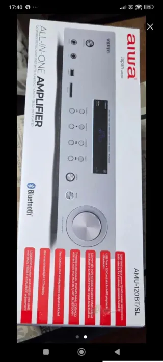 Amplificador todo en uno Aiwa AMU-120BT/SL. - Potencia de salida de 20W RMS por canal. - Conectividad Bluetooth. - Puerto USB y ranura para tarjeta SD para reproducción de MP3. - Entrada de auriculares estéreo de 6.35mm. - Entrada de micrófono. - Múltiples entradas de audio: PHONO (MM), CD/SACD, AUX IN 1, AUX IN 2, AUX IN 3, MIC, BLUETOOTH. - Salida de audio analógica Pre-Out/Line-Out. - Pantalla LCD con matriz de puntos y retroiluminación. - Función Loudness y control de volumen maestro con ajuste de graves, agudos y balance.