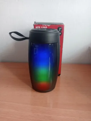 Altavoz portátil con luces LED que cambian de color. - Modelo HYX 1202. - Diseño cilíndrico. - Asa de transporte. - Luces LED RGB.