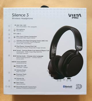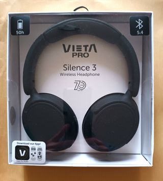 Auriculares circumaurales Vieta Pro Silence 3. Embalaje original. Gran calidad de sonido. Bluetooth 5.4, conexión simultánea a varios dispositivos. Disponible también conexión directa mediante cable+micrófono (incluido). Duración batería interna: hasta 50 h. Carga mediante conector USB-C (cable incluido). Cancelación de ruido ambiente de alta eficiencia. Modo baja latencia, especial para juegos y aplicaciones de altas exigencias. Diadema ajustable y cúpulas plegables (doble bisagra/doble giro). App Vieta gratuita en GooglePlay, para ecualización/personalización del sonido y función "Encuentra mi dispositivo".