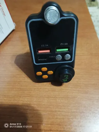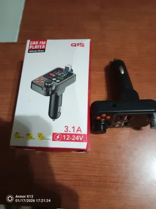 Adaptador para coche con múltiples funciones. - Puertos USB para carga rápida (3.1A y 1.0A). - Conexión Bluetooth para llamadas y música. - Pantalla LED. - Botones de control de reproducción y ecualización. - solo se utilizo unos días porque se compró un radio moderno para el coche.