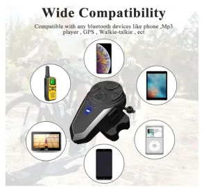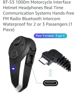 Auriculares para casco de motocicleta con interfaz Bluetooth. Permiten comunicación en tiempo real y radio FM. - Alcance de 1000m. - Resistente al agua. - Compatible con 2 o 3 pasajeros. - Versión con conexión Tipo C.