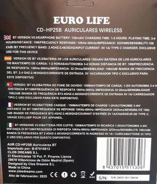 Auriculares Bluetooth 5.0 EURO LIFE Negros