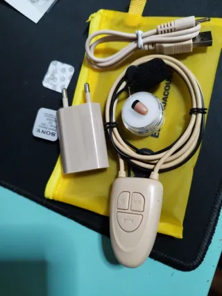 Pinganillo Bluetooth nuevo, ideal para comunicación discreta. Incluye todos los accesorios para su uso. - Pinganillo de color beige y negro. - Cargador de pared. - Cable USB. - Bolsa de transporte.
