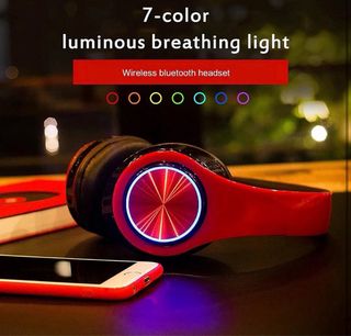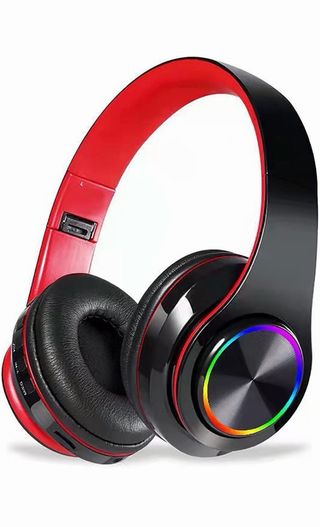 Auriculares inalámbricos con un diseño moderno y llamativo. - Conectividad Bluetooth. - Luces LED integradas en los auriculares. - Combinación de colores negro y rojo.