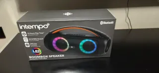 Altavoz portátil Intempo con luces LED y conexión Bluetooth. Ideal para llevar tu música a todas partes. - 10 horas de tiempo de reproducción. - Salida de 20 W RMS. - Función de emparejamiento TWS.
