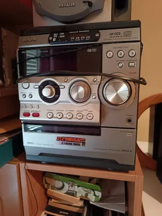 Mini cadena Aiwa con múltiples funciones para tu entretenimiento. - Reproducción de CD, CD-R/RW. - Conectividad USB y Bluetooth. - Doble deck para cintas de casete. - Sintonizador de radio FM/AM. - Entrada auxiliar (AUX). - Salida de auriculares (PHONES). - Potencia de 2x80W RMS.