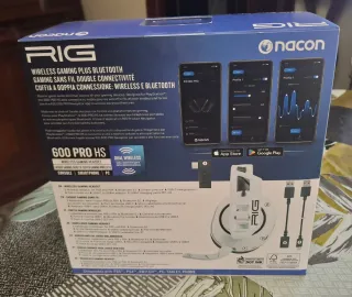 Auriculares inalámbricos RIG 600 PRO HS de Nacon, diseñados para una experiencia de juego versátil. - Conexión dual inalámbrica. - Compatibles con consolas, smartphones y PC. - Batería de 18 horas de duración. - Adaptador USB-C y Bluetooth 5.1.
