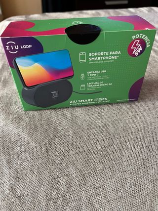 Altavoz Bluetooth Ziu Loop con soporte para smartphone. Permite cargar el móvil y leer tarjetas Micro SD. - Entrada USB y Tipo C para carga. - Lector de tarjetas Micro SD integrado. - Potencia de 5W.
