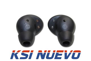 Auriculares inalámbricos en color negro. El estuche de carga muestra el porcentaje de batería. - Indicador de batería en el estuche. - Diseño ergonómico para mayor comodidad.