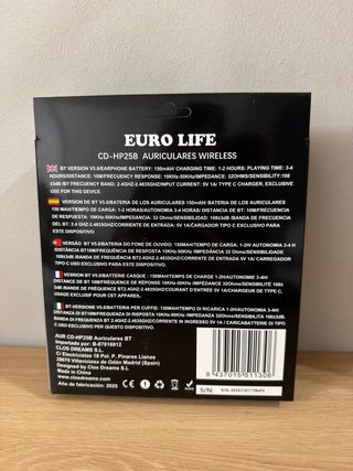 Auriculares inalámbricos EURO LIFE con tecnología Bluetooth 5.0. Nuevos en caja cerrada. - Conexión inalámbrica. - Ideal para escuchar música. - Permite realizar llamadas. - Batería recargable.