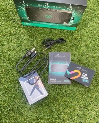 Estéticamente, la rejilla frontal tiene algunas marcas blanquecinas/desgaste que no se han quitado con la limpieza, pero es meramente visual y no afecta para nada al sonido. Es resistente al agua y tiene una calidad de sonido sorprendente para su tamaño. Se entrega con su caja original, manuales, cable de carga USB y cable jack de audio.