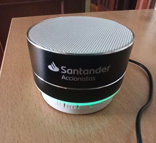 Altavoz portátil con diseño moderno y logo de Santander Accionistas. - Acabado en negro y plata. - Parte inferior con luz LED. - Conexión por cable.
