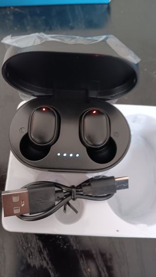 Auriculares inalámbricos de color negro, en perfecto estado. Son dos auriculares con su estuche de carga y cable USB. - Diseño compacto y ligero. - Estuche de carga incluido. - Conexión inalámbrica.