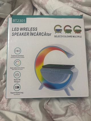 Altavoz LED inalámbrico con función de carga y radio FM. - Carga inalámbrica. - Siete opciones de color. - Radio FM. - Batería de larga duración.