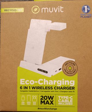 Cargador inalámbrico Muvit Eco-Charging 6 en 1. - Carga rápida de hasta 20W. - Incluye cable Type-C. - Fabricado con materiales reciclados y reciclables. - Compatible con relojes, teléfonos y auriculares.