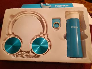 Vendo auriculares inalámbricos Honor. Son estéticamente impecables y vienen con un termo y un anillo para móvil a juego. - Auriculares con diseño elegante. - Termo de color azul. - Anillo para móvil.