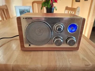Radio de estilo retro con acabado en madera y detalles plateados. Ideal para añadir un toque clásico a tu hogar. A red y a pilas.Entrada Aux. - Diseño vintage. - Sintonizador FM/AM. - Entrada auxiliar (AUX IN). - Dial de sintonización con luz azul.