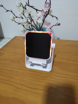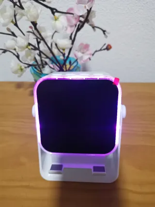 Altavoz de inducción para smartphone con un diseño moderno y llamativo. Su acabado combina blanco y detalles morados que le dan un toque elegante. Luz ambiental - Compatible con smartphones. - Diseño de inducción.