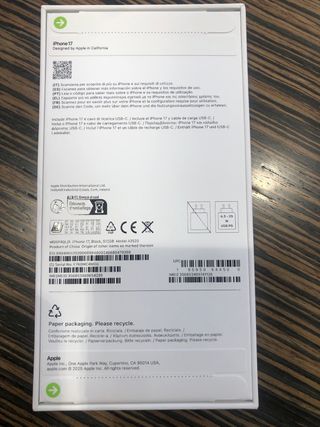 iPhone 17 en color negro con 512GB de almacenamiento, completamente precintado. - Modelo A3520. - Incluye cable de carga USB-C.