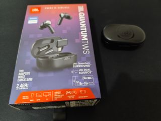 Auriculares inalámbricos JBL Quantum TWS en color negro. Disfruta de un sonido envolvente y cancelación de ruido adaptativa. - Conexión inalámbrica de baja latencia de 2.4GHz. - JBL Quantum Surround™ y JBL Dual Source™. - Hasta 24 horas de autonomía total (8h + 16h). - Compatibles con PC, Móvil, Laptop, PlayStation y Nintendo Switch.