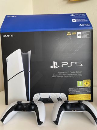 Consola Playstation 5 en color blanco, 1 tb. - Incluye dos mandos DualSense. - Modelo Digital Edition. Comprada en julio de 2025 de página original de sony playstation, en perfecto estado. Se vende debido a que no se usa.