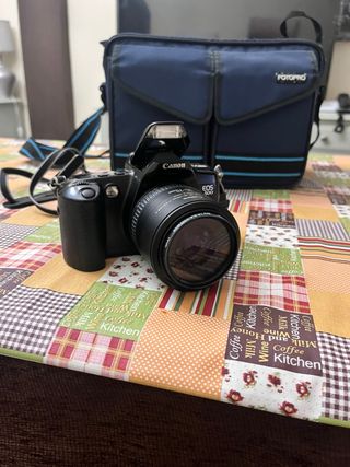 Cámara réflex Canon EOS 500 en color negro, junto con un bolso de transporte Fotopro en color azul marino. - Cámara réflex analógica. - Incluye bolso de transporte.