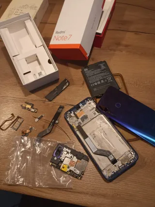 Piezas de repuesto para Xiaomi Redmi Note 7. Ideal para reparaciones o para obtener componentes. - Componentes electrónicos. - Batería. - Chasis. - Caja original.