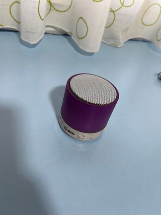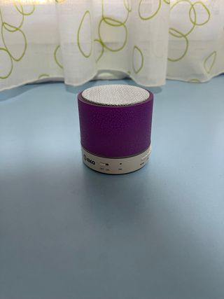 Altavoz portátil de color morado con un diseño compacto y moderno. Ideal para llevar tu música a todas partes. - Altavoz con acabado texturizado. - Rejilla superior metálica. - Incluye cable original