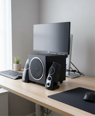 Sistema de altavoces Logitech Z523 2.1 con subwoofer. - Sonido envolvente de 360 grados. - Potencia de 40W RMS. - Controles de volumen y graves integrados en el altavoz satélite derecho.