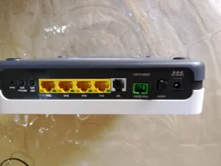Router de fibra óptica de Movistar. - Diseño moderno con acabado en gris oscuro. - Bordes con rejilla para ventilación.