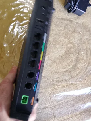Router Orange Livebox en color negro. Presenta un diseño con múltiples orificios en la parte superior para ventilación. - Indicadores LED en la parte frontal. - Incluye adaptador de corriente.